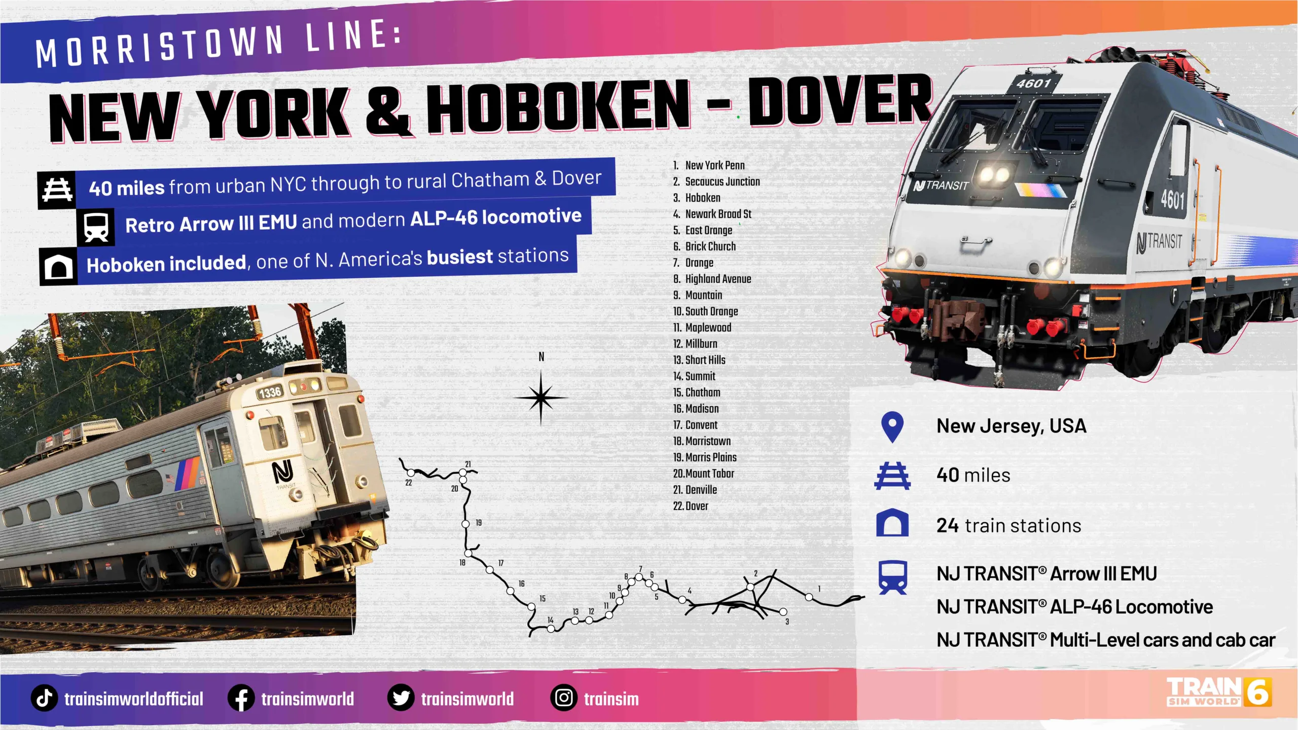 The Morristown Line route will run from New York & Hoboken to Dover. The line itself dates back to the 1830s, running Morristown–Rockaway, and later being extended from Rockaway-Dover. The line runs through both dense urban areas, along with more suburban areas, and will cover 40 miles in the simulator.