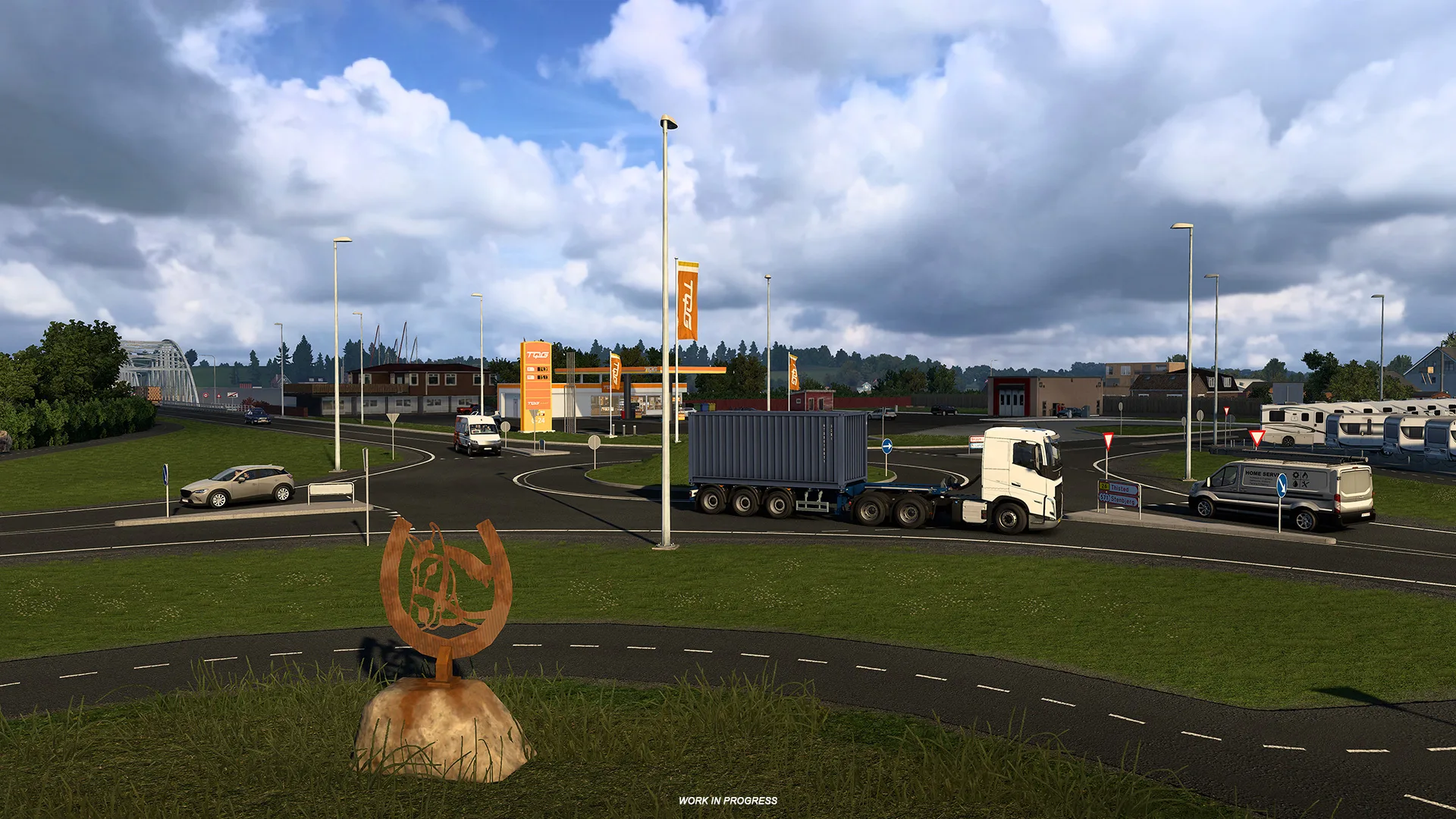 Then towards the west, the new route passed near the town of Skive. While Road 26 skirts around the town, SCS has modeled in four of the 11 Stars of Skive, which is a series of sculptures placed in roundabouts. While SCS didn’t provide a preview of these, you can see a preview of what they look like in real life here. The sculptures modelled in the simulator with this rework are orvet, Tegnet, Vestenvinden, and Kraka.